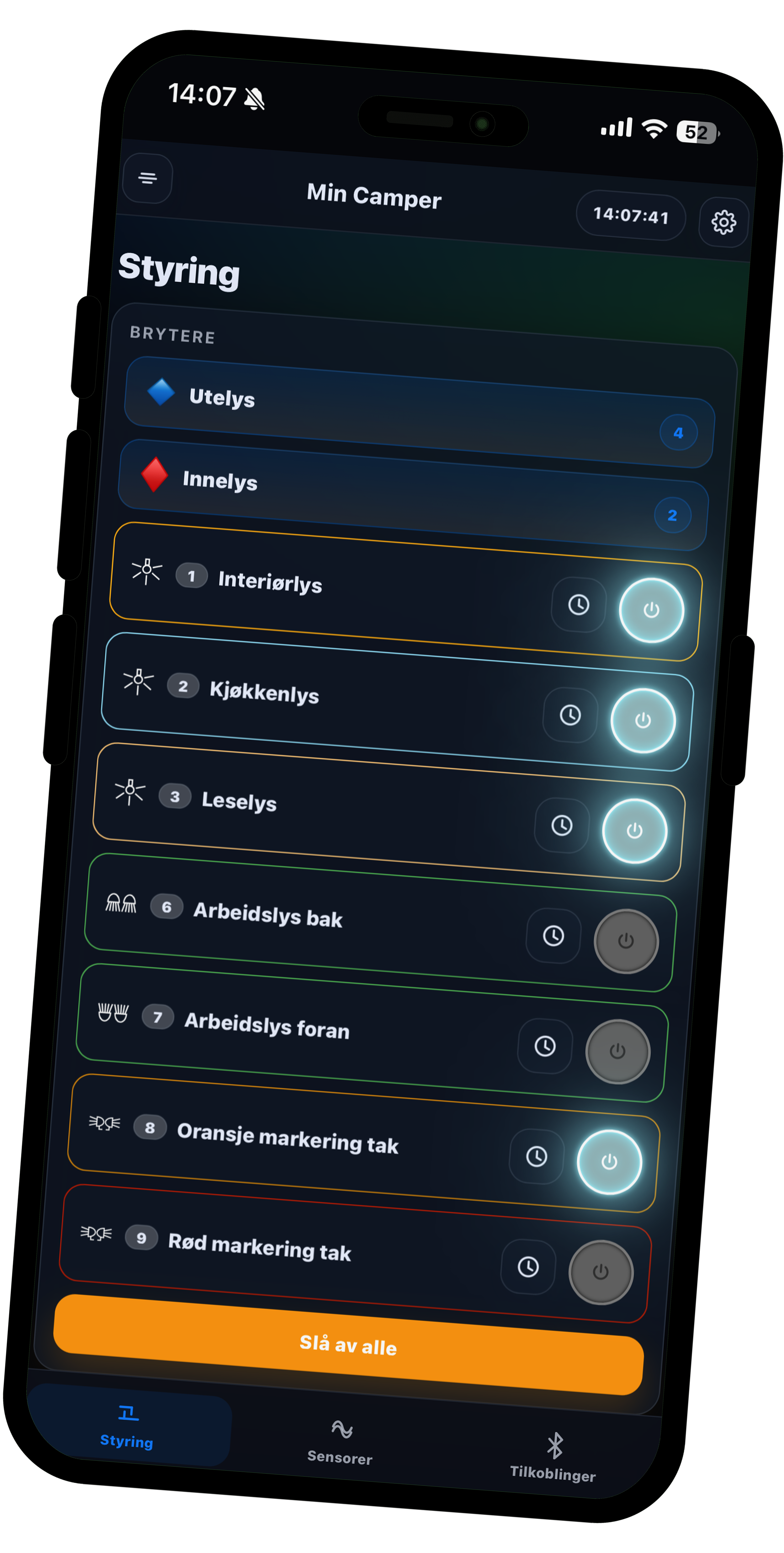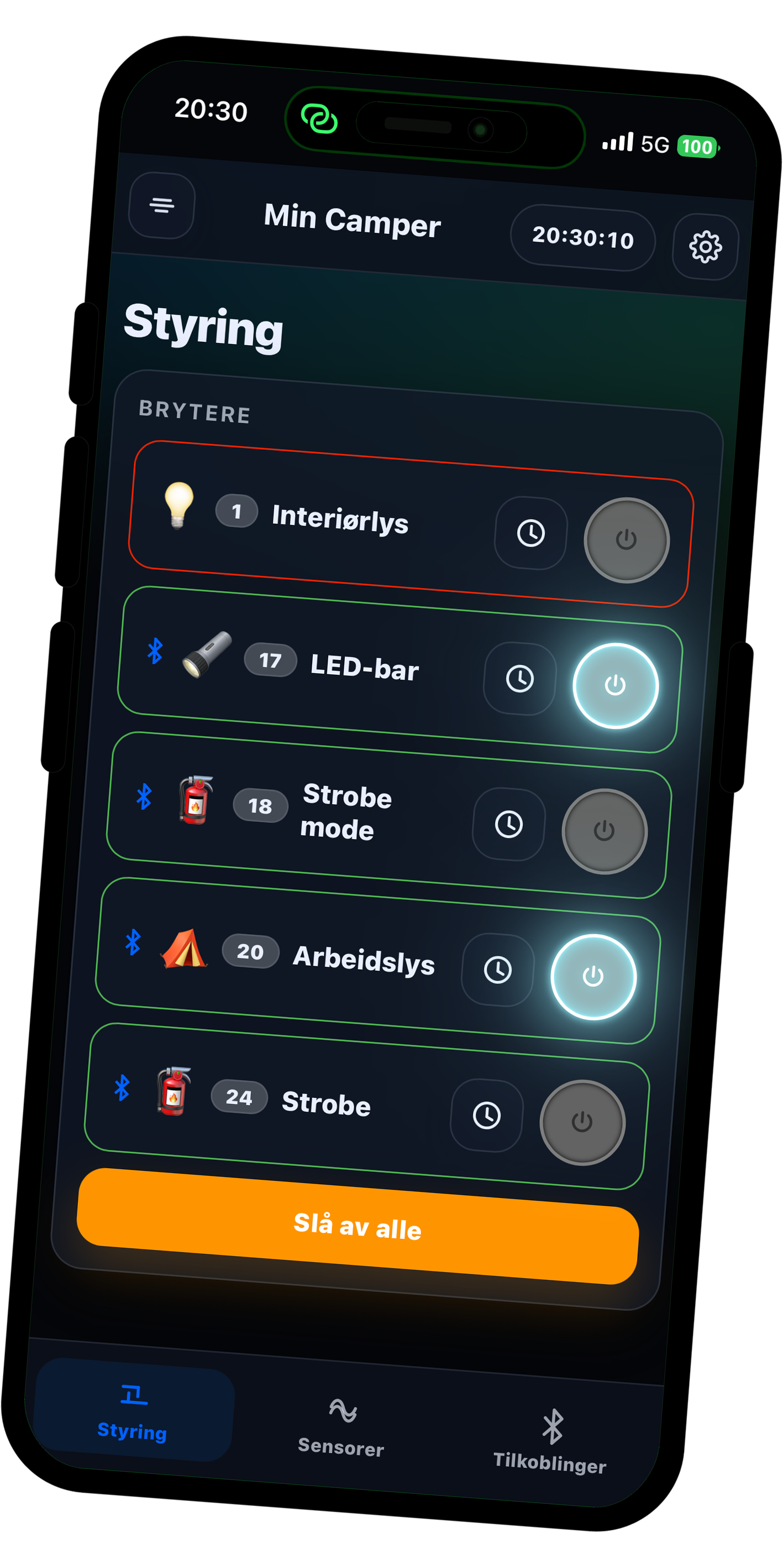 Med 16 kanaler og full app-styring kan du kontrollere alt fra smarttelefonen din, og koble til de sensorene du trenger. Både kablede reléer og Bluetooth®-styrte reléer kan også kobles til kontrollboksen. Systemet er fullstendig modulært, og alle tilleggsproduktene er tilpasset fritidsobjektet og -situasjonen det skal brukes i.